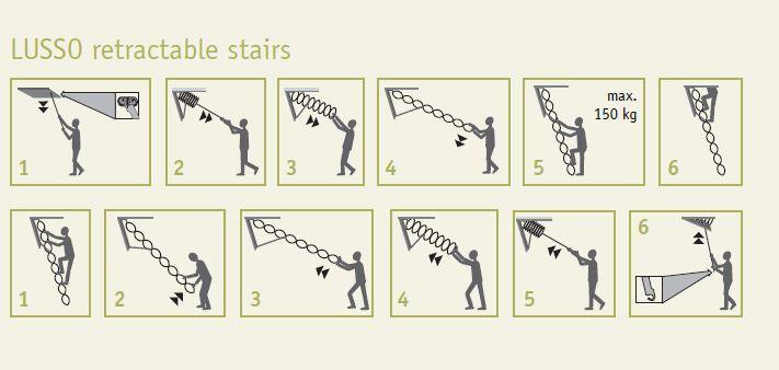 הסולם הוא סולם "שמיניות", לאחיזה אמינה, מגיע עם ידיעות עליונות שמתחברות מעל הפתח המאפשרים תמיכה בעיקר בירידה מהסולם ומוט פתיחה ידני לתפעול הסולם. אורך האקורדיון עד 3 מטר [בין רצפה לתקרה]